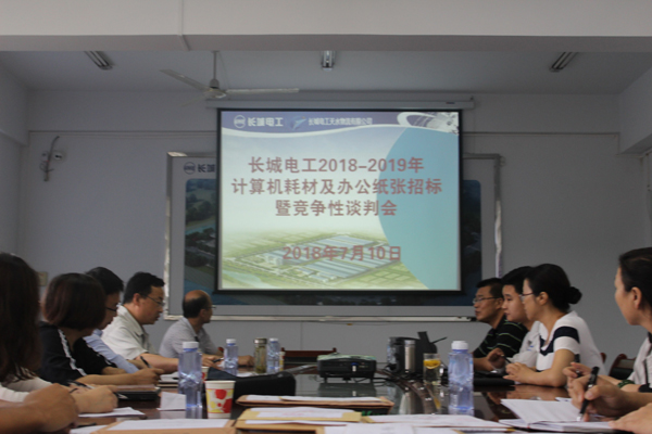 2018年7月10日,長城電工辦公用紙張及計算機耗材招標(biāo)暨競爭性談判會在物流公司召開。本次招標(biāo)按長城電工招標(biāo)專家?guī)旃芾磙k法,抽取了5位評標(biāo)專家, 3位物資使用公司代表參加,8家投標(biāo)方代表及工作人員共計20余人參加會議。